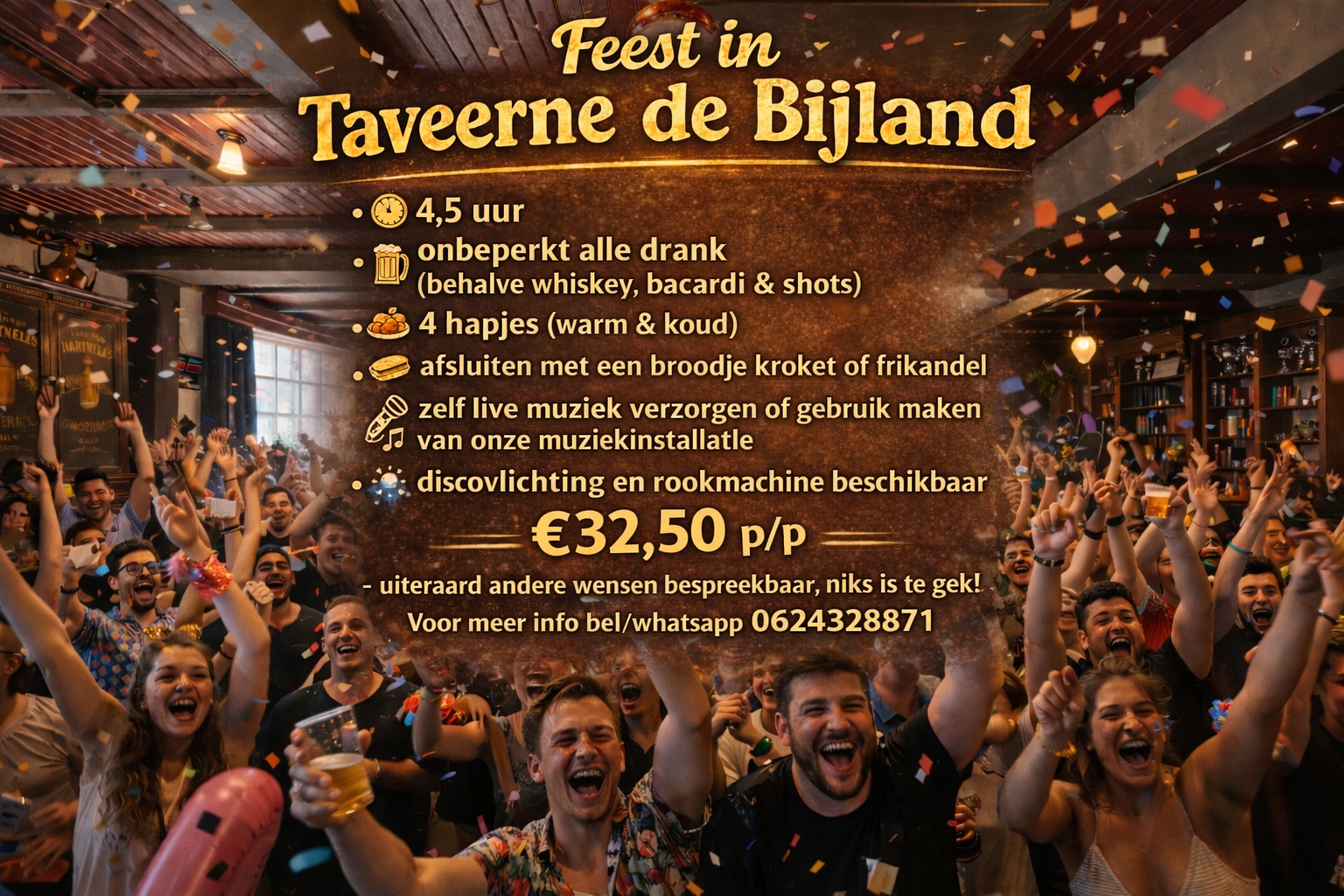 Taveerne de Bijland is gevestigd in het hart van Tolkamer. en staat bekend om zijn gezellige sfeer en gastvrije service. Onze feestzaal is ideaal voor allerlei evenementen, van bruiloften en verjaardagen tot bedrijfsfeesten. Ons café is de perfecte plek om te ontspannen met vrienden en familie, met een uitgebreide selectie van bieren. Bij Taveerne de Bijland doen we er alles aan om uw bezoek onvergetelijk te maken.